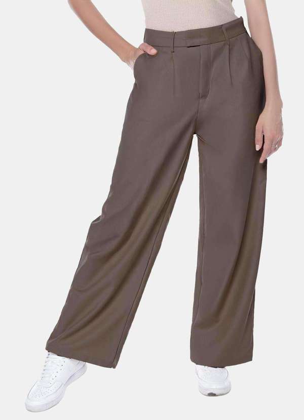 Sob - Calça de Pregas Marrom Café Cintura Alta em Viscose com - Marrom