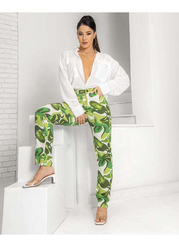 Consciência - Calca Feminina Mom Cintura Alta Estampada Verde com Elastano Verde