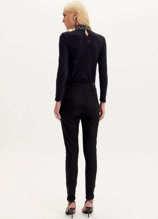 A calça jeans feminina é a aposta certa para um visual sofisticado. Apresenta modelagem jegging, cintura alta e fechamento lateral por zíper. As aplicações de brilhos valorizam a peça e permitem produções cheias de personalidade. Invista!