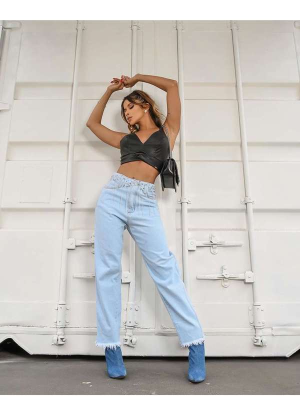 Consciência - Calca Jeans Mom Feminina Cintura Alta com Aplicacao Azul