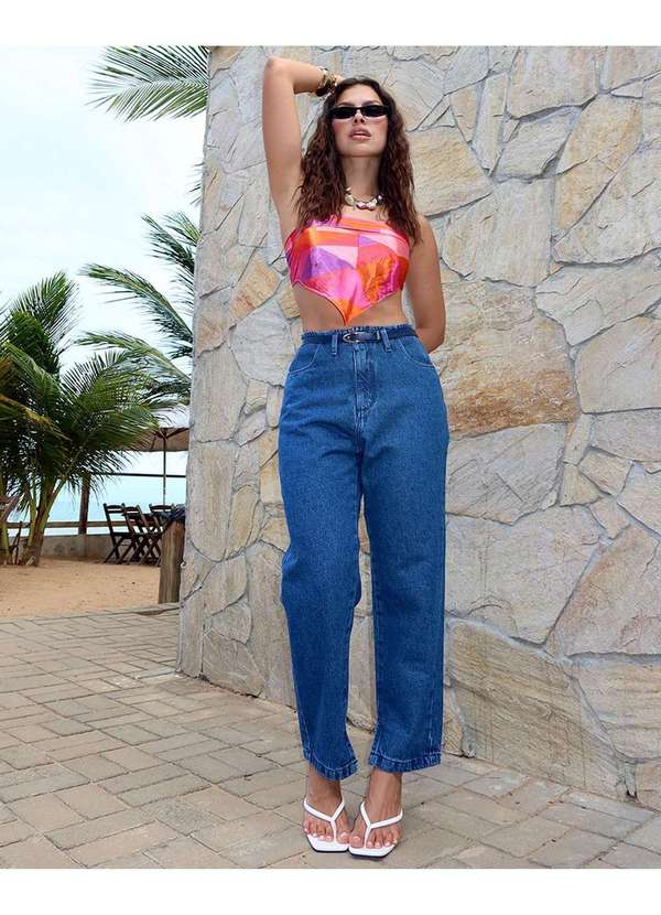 Consciência - Calca Jeans Reta Straight Feminina Cintura Alta com Cinto Azul