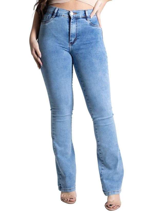A modelagem boot cut tem o caimento ajustado nas pernas e levemente ampla barra. Cintura alta Fechamento com botão e zíper Bolsos frontais falsos e posteriores funcionais Barra simples Modelagem: boot cut Tecido: Jeans Tipo de lavagem: Azul Cor: Azul medio