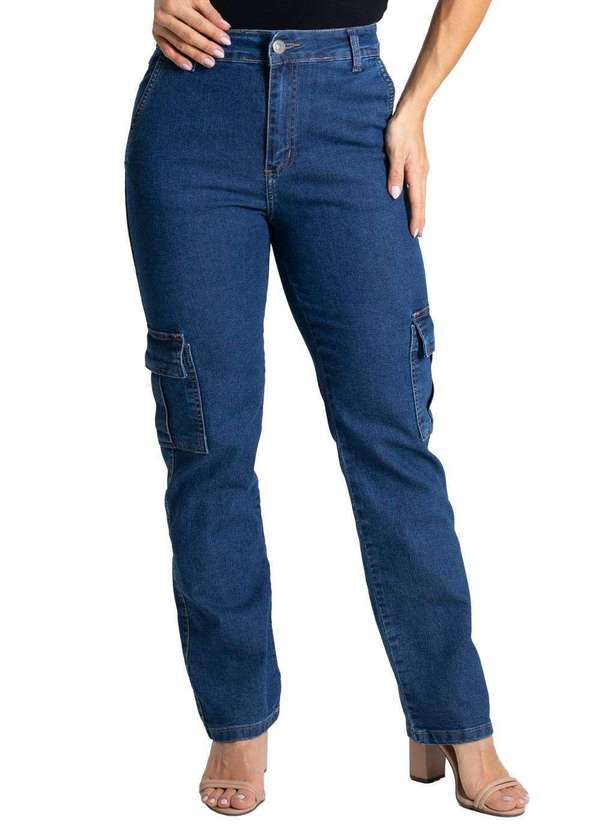 Calça jeans feminina de modelagem reta, com caimento mais solto ao corpo. Cintura alta Fechamento com botão e zíper Bolsos frontais, laterais cargos e traseiros basicos funcionais Barra simples Tecido: Jeans Tipo de lavagem: Azul Cor: Azul médioComposição: 83% ALGODÃO 15% POLIÉSTER 02% ELASTANO