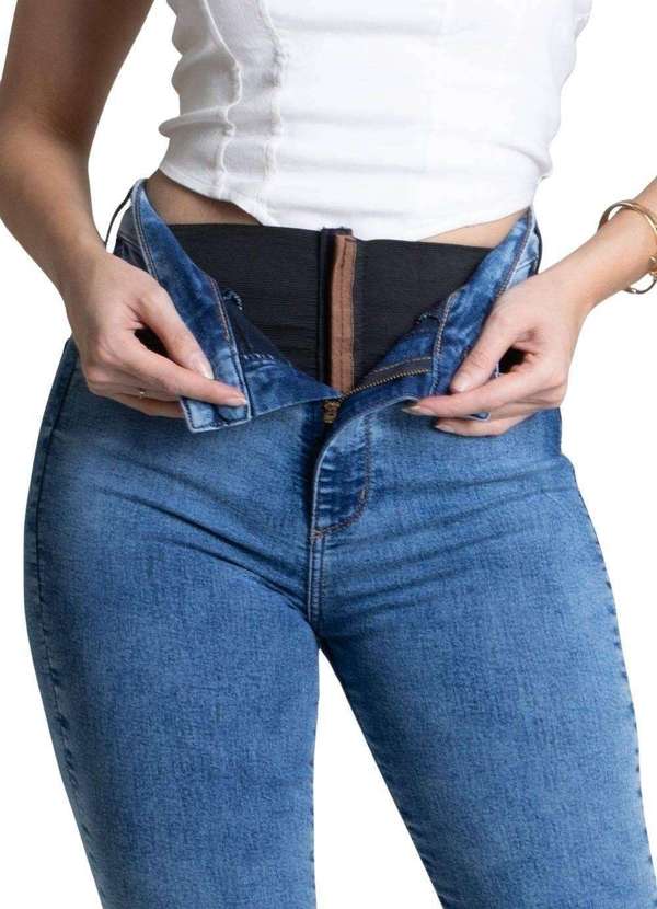 Calça super lipo confeccionada em jeans. A modelagem possui uma cinta proporcionando ajuste perfeito para o seu corpo Cintura alta Fechamento com botão e zíper Bolsos frontais falsos e bolsos traseiros funcionais Barra acabamento simples Modelagem: Super lipo Tecido: Jeans Tipo de lavagem: Azul médio Cor: Azul médioComposição: 72% Algodão 26% Poliéster 2% Elastano