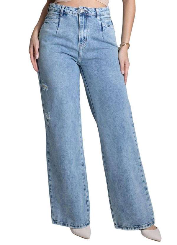 Calça feminina confeccionada em jeans. O modelo possui cintura super alta, gancho no lugar e caimento amplo da coxa até a barra. Cintura alta Fechamento através de um botão e zíper Bolsos frontais com leves puídos e posteriores funcionais Barra simples Tecido: Jeans Tipo de Lavagem: Azul Cor: Azul claroComposição: 100% ALGODÃOTipo de lavagem: FINA ESTAMPA
