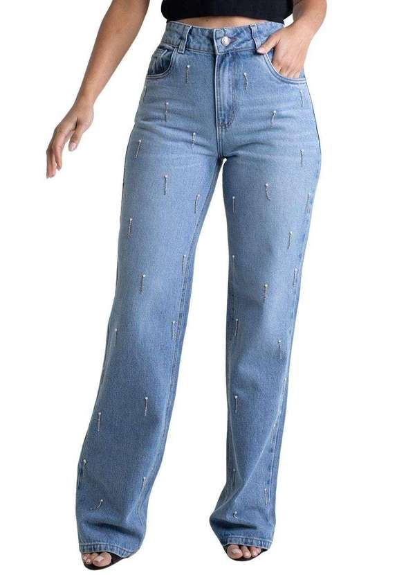 Calça feminina confeccionada em jeans. O modelo possui cintura super alta, gancho no lugar e caimento amplo da coxa até a barra. O detalhe fica por conta das aplicações de strass. Cintura alta Fechamento através de um botão e zíper Bolsos frontais e posteriores funcionais Barra simples Tecido: Jeans Tipo de Lavagem: Azul Cor: Azul claroComposição: 100% ALGODÃOTipo de lavagem: PLUMA
