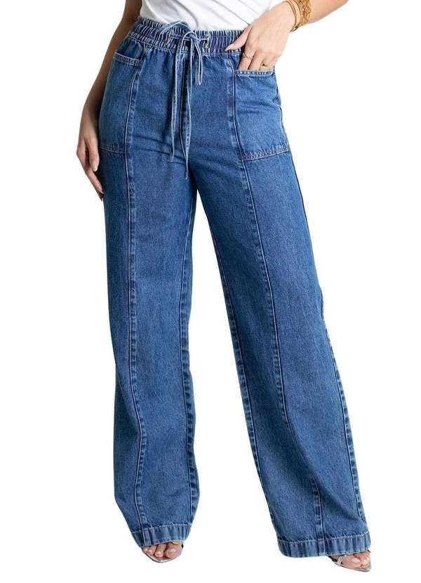 Calça confeccionada em jeans. O modelo possui cintura super alta, gancho no lugar e caimento amplo da coxa até a barra. Cintura alta, cós tem elastico embutido, cordão com o mesmo tecido para amarração. Bolsos frontais e posteriores funcionais Barra simplesTecido: Jeans Tipo de Lavagem: azul Cor: Azul médioComposição: 100% ALGODÃOTipo de lavagem: CIDADE VERDE