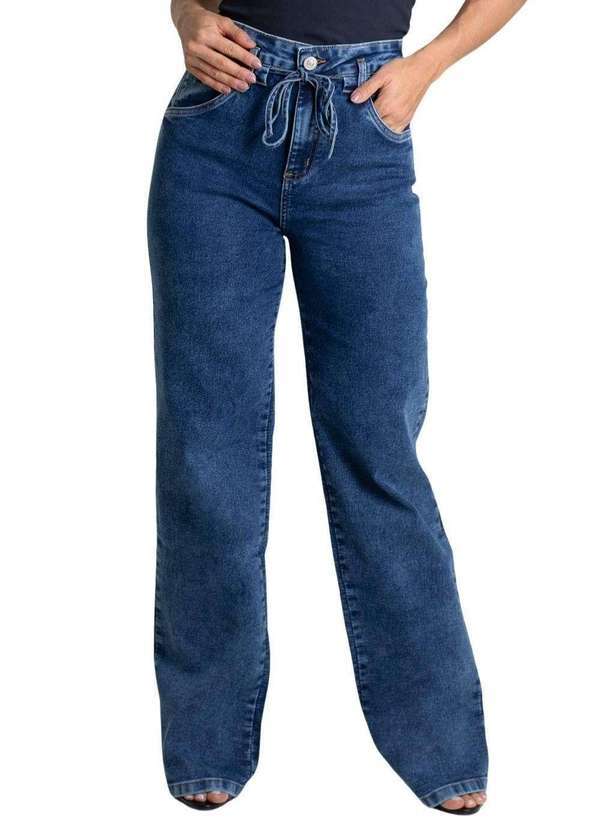 Calça feminina confeccionada em jeans. O modelo possui cintura super alta, gancho no lugar e caimento amplo da coxa até a barra. Cintura alta Fechamento através de um botão e zíper.cós acompanha um cordão com o mesmo tecido para amarração Bolsos frontais e posteriores funcionais Barra simples Tecido: Jeans Tipo de Lavagem: azul Cor: Azul claroComposição: 76% ALGODÃO 22% POLIÉSTER 02% ELASTANOTipo de lavagem: KENNELAN