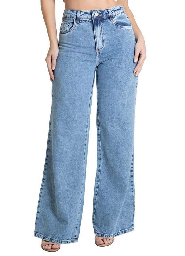 Calça feminina confeccionada em jeans. O modelo possui cintura super alta, gancho no lugar e caimento amplo da coxa até a barra. Fechamento através de um botão e zíper Bolsos frontais e posteriores funcionais Barra simples Tecido: Jeans Tipo de Lavagem: Azul Cor: Azul claroComposição: 100% ALGODÃO