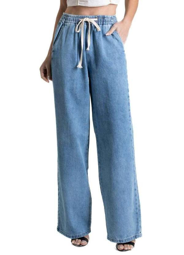 Calça feminina confeccionada em jeans. O modelo possui cintura super alta, gancho no lugar e caimento amplo da coxa até a barra. Cintura altaFechamento através de um botão e zíper.cós acompanha um cordão para amarração Bolsos frontais e posteriores funcionais Barra simples Tecido: Jeans Tipo de Lavagem: azul Cor: AzulComposição: 100% ALGODÃOTipo de lavagem: CIDADE VERDE