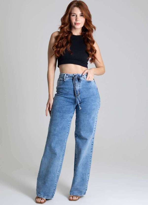 Calça feminina confeccionada em jeans. O modelo possui cintura super alta, gancho no lugar e caimento amplo da coxa até a barra. Cintura alta Fechamento através de um botão e zíper Bolsos frontais e posteriores funcionais Barra simples Tecido: Jeans Tipo de Lavagem: Azul Cor: Azul claroComposição: 80% Algodão 18% Poliéster 2% Elastano