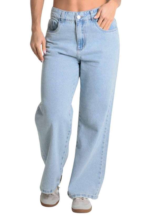Calça feminina confeccionada em jeans.om caimento mais solto ao corpo. Possui aplicação de strass em toda parte frontal Cintura alta Fechamento com botão e zíper Bolsos frontais e bolsos traseiros basicos funcionais Barra simples Tecido: Jeans Tipo de lavagem: Azul Cor: Azul claroComposição: 100% ALGODÃO
