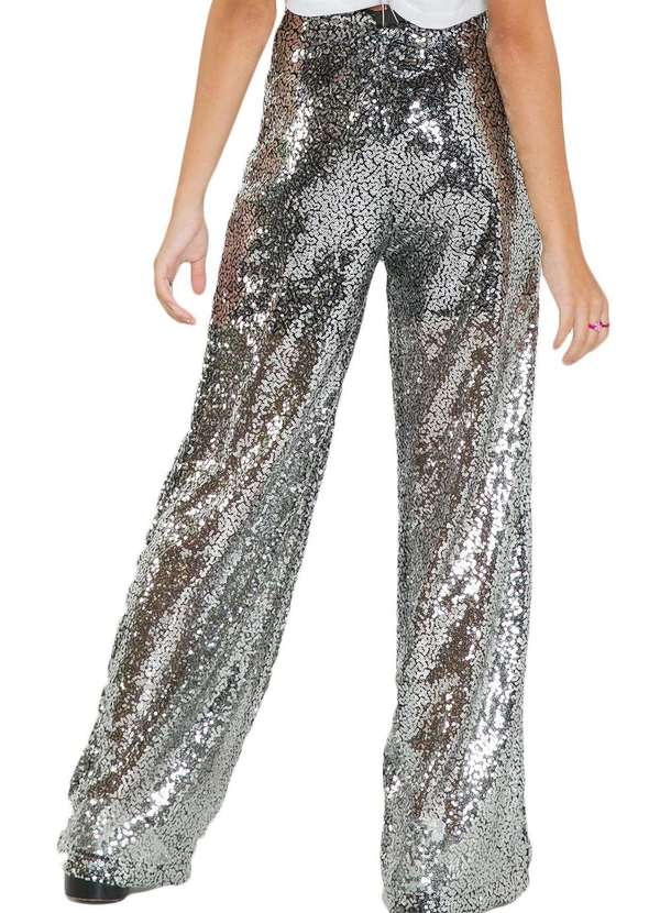 Calça Juvenil Paetê Prata LLiccie. Calça cintura alta, flare com acabamento em paetê. Forro interto 100% algodão. Sobre a marca: Perfeita para vestir as crianças com muito estilo e criatividade!