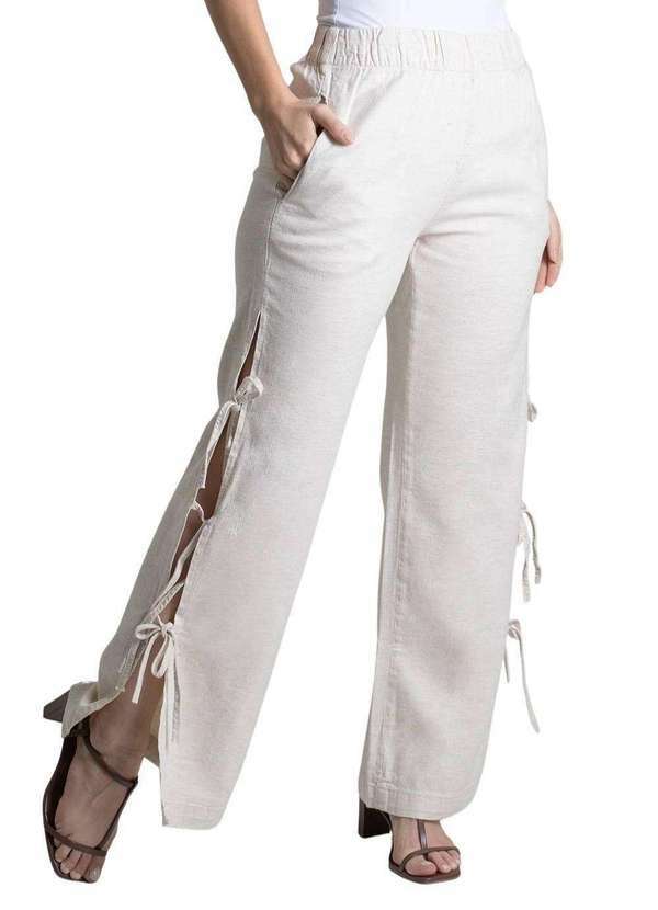 Calça feminina confeccionada em linho. O modelo pantalona possui cintura alta, gancho no lugar e caimento amplo da coxa até a barra. Cintura alta Bolsos frontais, detalhe por conta na fenda lateral com amarração. funcionais Barra simples Tecido: linho Tipo de Lavagem: Color Cor: AreiaComposição: 64% CO 25%VISCOSE 11% LINHOTipo de lavagem: AMACIADO