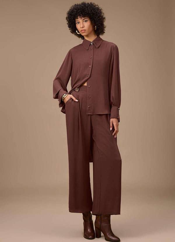 Sinta-se confiante e elegante com esta calça pantalona de cintura alta, que combina a sofisticação da alfaiataria com o conforto do chiffon. Em um tom marrom terroso, essa peça é perfeita para transitar do escritório a um jantar especial, capturando o calor das fachadas italianas. Combine-a com uma blusa de seda e acessórios dourados, criando um visual que expressa sua autenticidade e estilo.