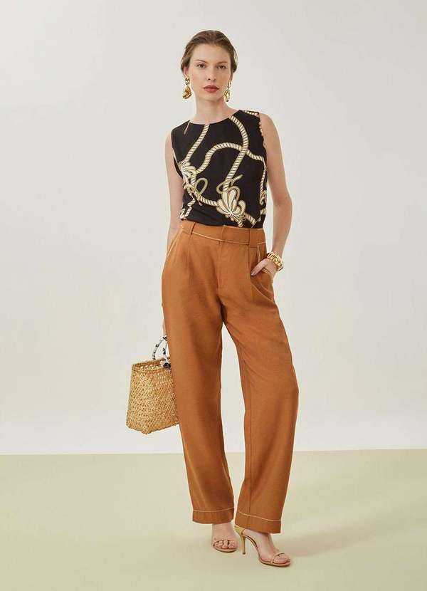 A calça reta de cintura alta em tom marrom da Maria.Valentina é um ícone de sofisticação e modernidade. Feita de viscose com um toque de poliéster, ela garante um caimento impecável e conforto inigualável. Ideal para mulheres que buscam elegância em qualquer ocasião, essa peça valoriza a silhueta de forma sutil. Combine com uma blusa de seda para eventos sociais ou uma t-shirt para um look casual chic. Complemente com acessórios dourados e uma bolsa estruturada para um toque extra de glamour. A peça faz parte da coleção que traduz a essência do verão, onde memórias e elegância se entrelaçam. Integre esta calça ao seu guarda-roupa e sinta-se confiante em cada passo.
