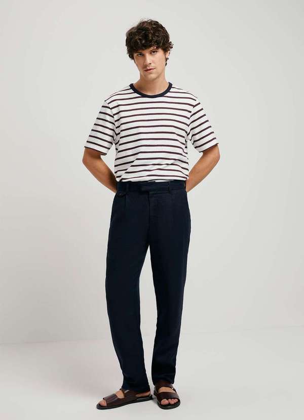 Calça masculina reta em rami, a escolha ideal para seu look casual. Esta peça tem o estilo de alfaiataria mas é feita em tecido de rami, uma fibra natural de textura leve e toque suave que promove menor impacto ambiental, maior resistência e durabilidade e ainda absorve a transpiração e mantém o corpo fresco em climas quentes. Detalhes da peça: Em tecido Modelagem reta Cós alfaiatado Braguilha com zíper de metal Bolsos faca frontais Bolsos traseiros com botão