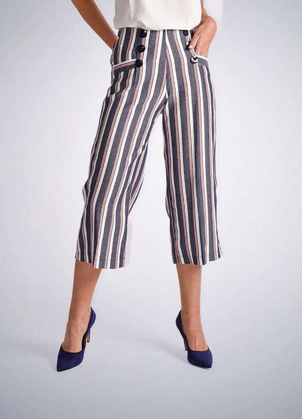 Lamis - Calca Pantacourt em Linho Listrada com Botoes Azul