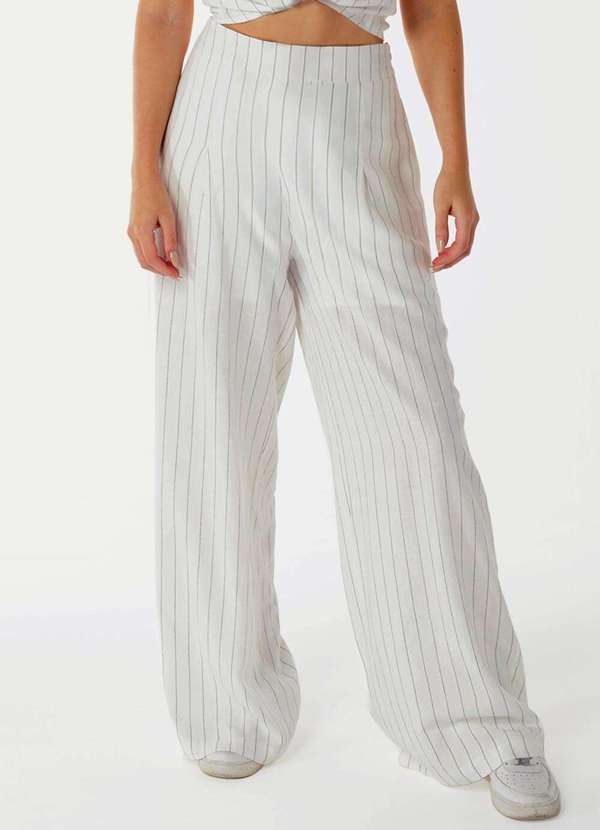 Sob - Calça Pantalona de Linho Branca Risca de Giz com Bolsos - Branco
