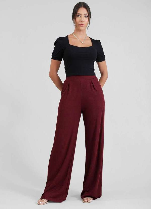 Pop Me - Calca Pantalona em Malha Canelada com Pregas Bolso Vermelho