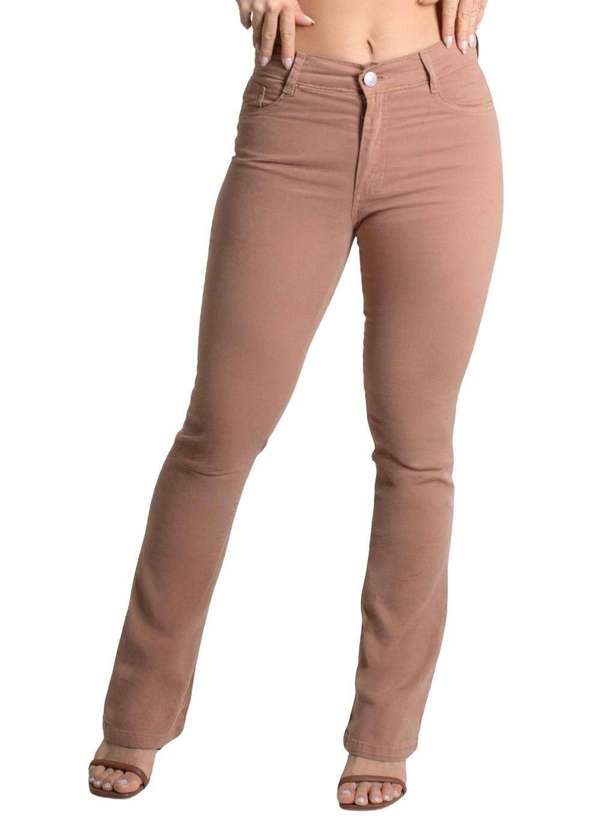 A modelagem tem o caimento ajustado nas pernas e levemente ampla barra. Cintura alta Fechamento com botão e zíper Bolsos frontais falsos e bolsos traseiros funcionais Barra acabamento simples Modelagem: boot cut Tecido: Sarja Tipo de lavagem: Color Cor: marromComposição: 98% ALGODÃO 02% ELASTANO