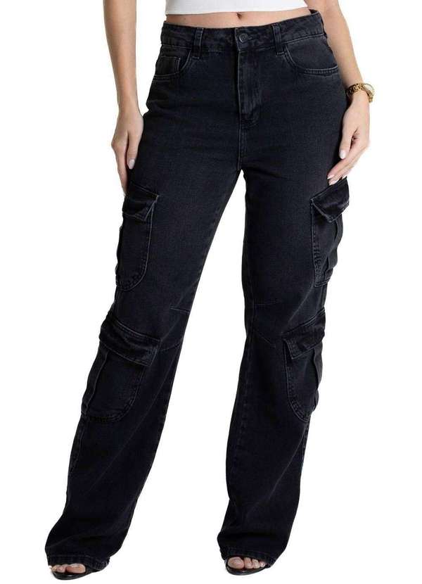 Calça feminina confeccionada em jeans. O modelo possui cintura super alta, gancho no lugar e caimento amplo da coxa até a barra. Cintura alta Fechamento através de um botão e zíper Bolsos frontais e posteriores funcionais bolsos laterais cargo Barra simples Tecido: Jeans Tipo de Lavagem: color Cor: pretaComposição: 100% ALGODÃOTipo de lavagem: FINA ESTAMPA
