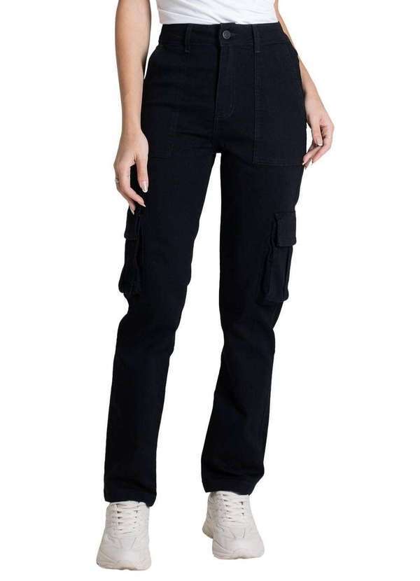 Calça sarja feminina de modelagem reta, com caimento mais solto ao corpo. Cintura alta Fechamento com botão e zíper Bolsos frontais e bolsos traseiros funcionais Barra com acabamento simples Tecido: Sarja Tipo de lavagem: Color Cor: preto