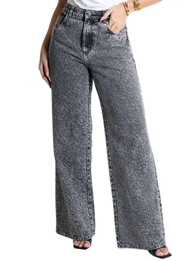Calça feminina confeccionada em sarja. O modelo possui cintura super alta, gancho no lugar e caimento amplo da coxa até a barra. Cintura alta Fechamento através de um botão e zíper Bolsos frontais e posteriores funcionais Barra simples Tecido: Sarja Tipo de Lavagem: animal print Cor: colorComposição: 100% ALGODÃO