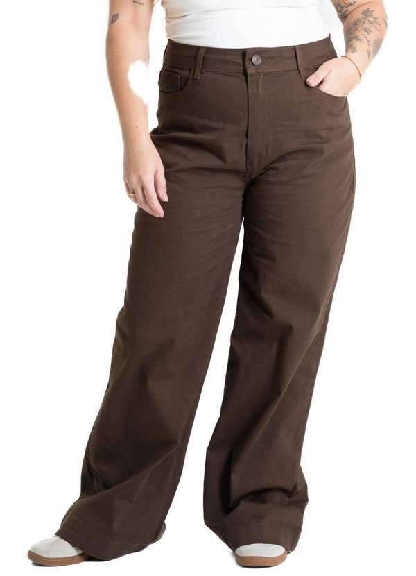 Calça plus size confeccionada em sarja.O modelo possui cintura super alta, gancho no lugar e caimento amplo da coxa até a barra. Cintura alta Fechamento através de um botão e zíperBolsos frontais e posteriores funcionais Barra simples Tecido: sarja Tipo de Lavagem: Color Cor: MarromComposição: 97,5% CO 2,5% ELASTANOTipo de lavagem: AMACIADO