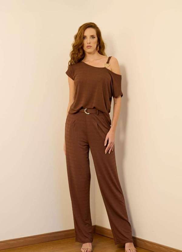 Pop Me - Calca Wide Leg em Malha Texturizada com Cinto Marrom