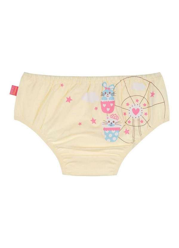 Características: Calcinha infantil básica Confeccionada em malha de algodão Estampa localizada de Roda Gigante na parte de trás Viés em microfibra super macio nas pernas e no cós Detalhe de lacinho de cetim no cós Composição: Corpo e Forro Fundo: 100% Algodão