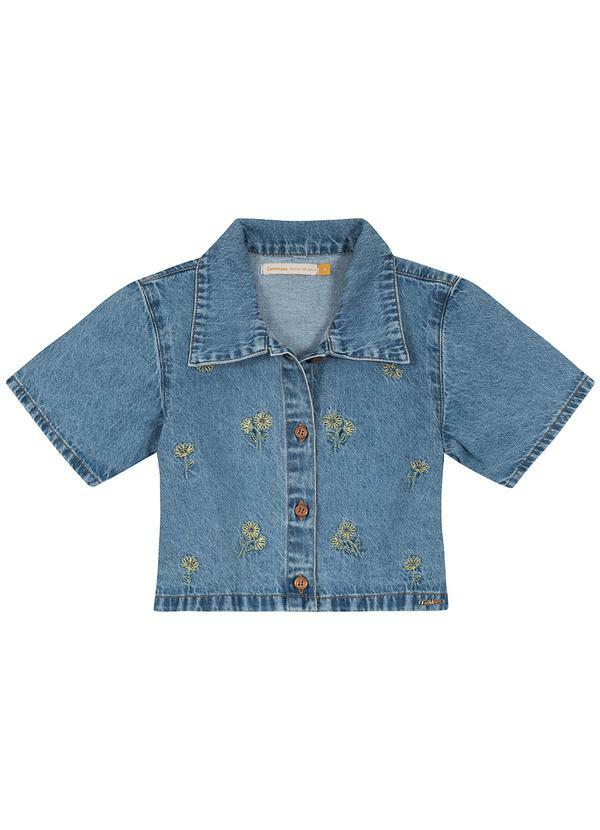 Carinhoso - Camisa Azul Claro Cropped Jeans Bordada Menina