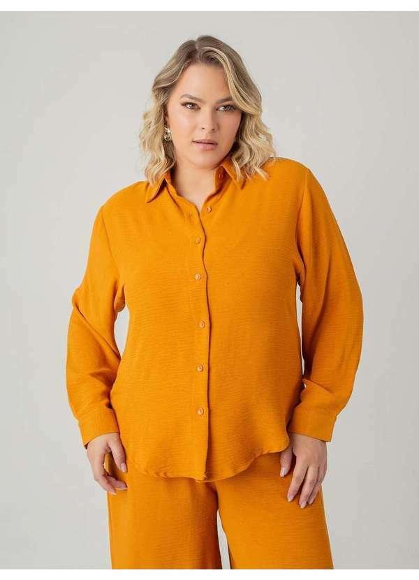 Camisa em crepe heavy flow e modelagem oversized. Possui gola colarinho, mangas longas com pregas e botão no punho, nas costas a barra é alongada, arredondada e assimétrica. O fechamento é frontal com botões de massa de mesma cor. Peça elegante e feminina. Para propostas mais casuais, combine calça jeans flare e scarpin.