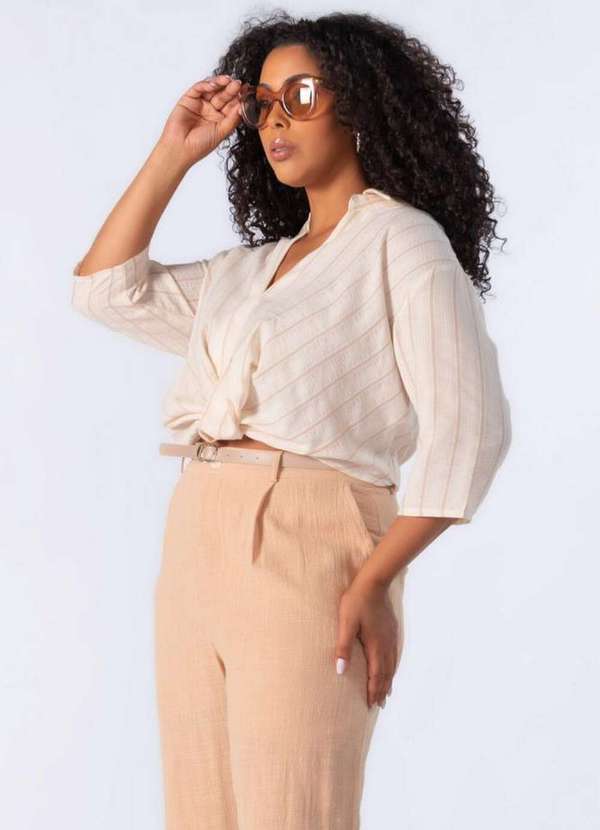 Lamis - Camisa Cropped em Algodao Listrada Bege