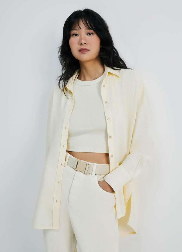 Camisa feminina manga longa ampla com linho, tem o estilo básico sofisticado para usar todos os dias da semana. Elaborada em tecido de viscose, linho e fibras naturais, garante toque suave e muito conforto. Detalhes da peça: Em tecido Modelagem ampla Comprimento alongado Manga longa Gola tradicional Vista com botões Fendas nas laterais