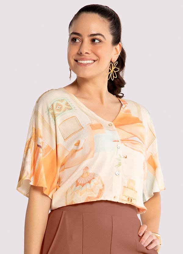 Lunender - Camisa Manga Curta em Viscose Estampada Laranja