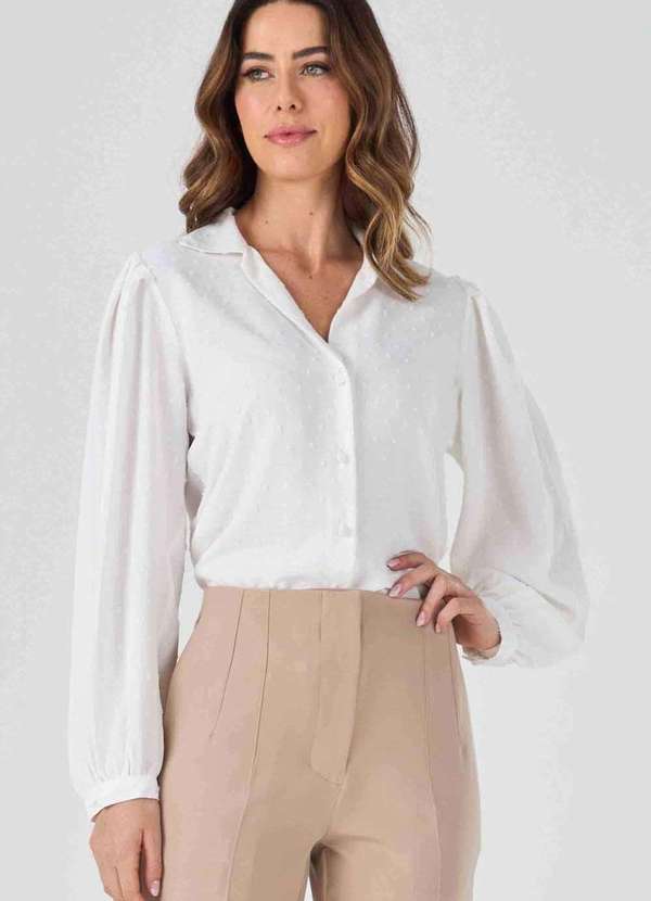 Camisa confeccionada em tecido leve com superfície texturizada de padronagem poá, cor off white, com toque macio, excelente caimento e que não amassa com facilidade. A peça possui colarinho tradicional, shape solto, caimento reto, mangas longas com pregas e abotoamento nos punhos, fechamento por botões forrados e acabamento pespontado. Camisa é uma peça essencial no closet feminino, ideal para quem ama se vestir com elegância e criar produções estilosas para diversas ocasiões. Invista nessa camisa clássica e atemporal, que possui excelente modelagem e um tecido diferenciado de poá que garante um toque único e sofisticado à peça.