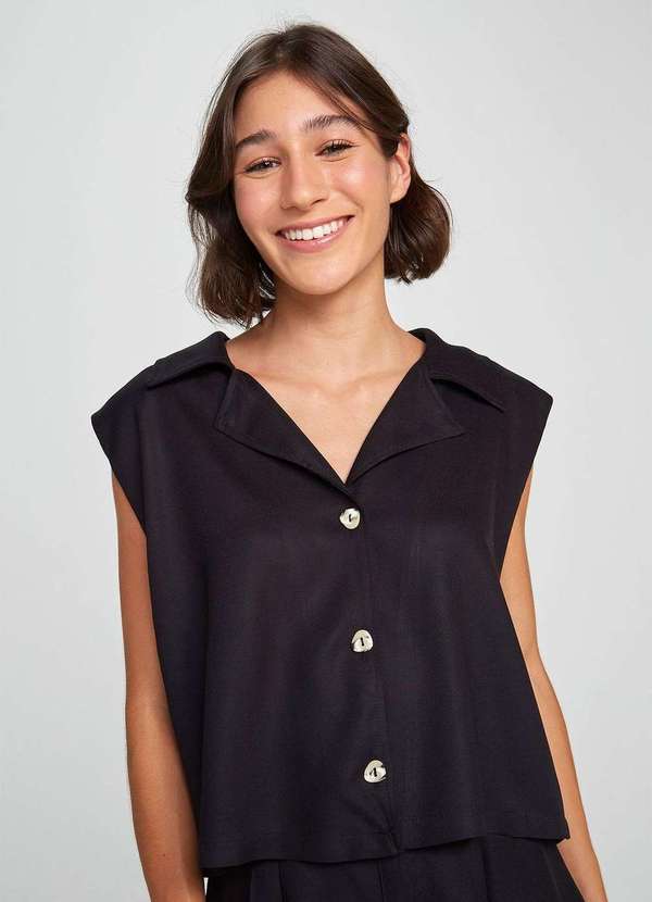 Camisa Muscle Tee Feminina Sem Manga. Confeccionada em tecido de viscose e linho, com modelagem reta, sem mangas e ombros levemente alongados, formando o shape muscle tee com comprimento até acima do quadril. A peça exibe gola resort, parecia com a de blazers e fechamento funcional com botões diferenciados.