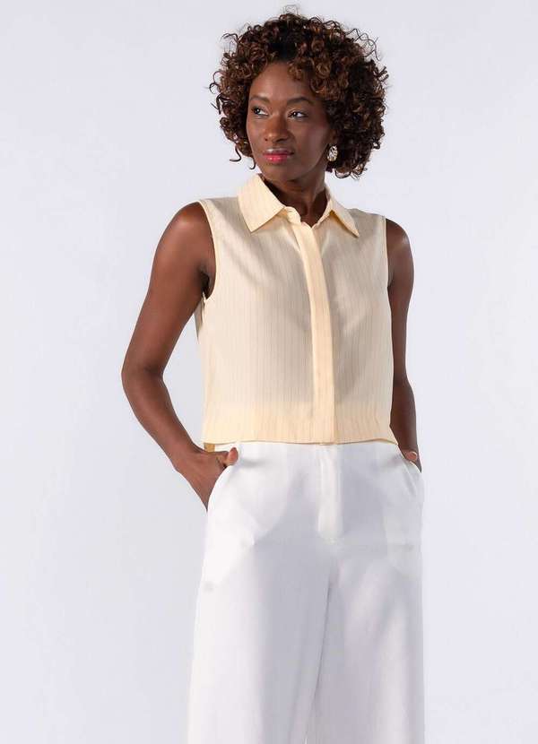 Camisa curta sem manga risca de giz Dica: Usar com calça pantalona e tênis Composição: 99% poliéster 01% viscose Modelo usa loira: Tamanho P - Medidas 1,78 de altura | 55kg. Modelo usa: Tamanho P - Medidas 1,75 de altura | Peso: 59kg