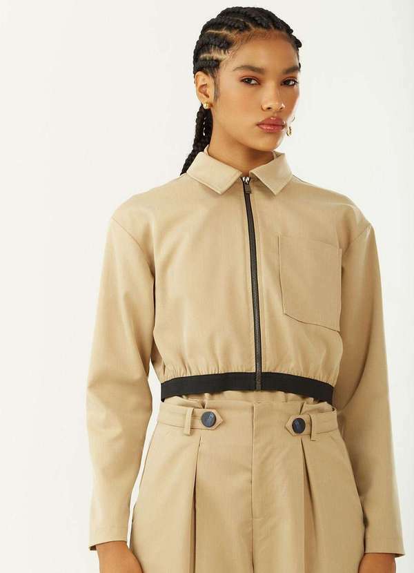 Zinco - Camisa Zinco Solta Gola Tradicional Manga Longa Cropped Bege Bege