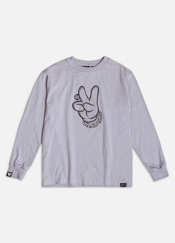 Estilo e atitude com o Team Mickey! Esta camiseta cinza de manga longa combina a clássica mão do Mickey em um design moderno e minimalista. Com detalhes que destacam o time mais famoso da Disney, é uma peça que equilibra diversão e versatilidade para meninos que adoram moda casual. Ref.: D2565
