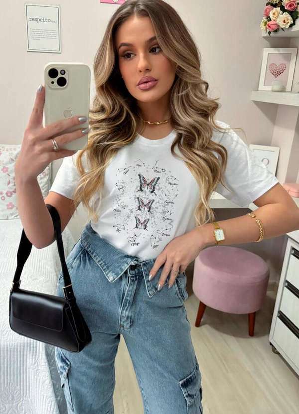 Cianitas - Camiseta Feminina Branca Borboletas Signos - Branca