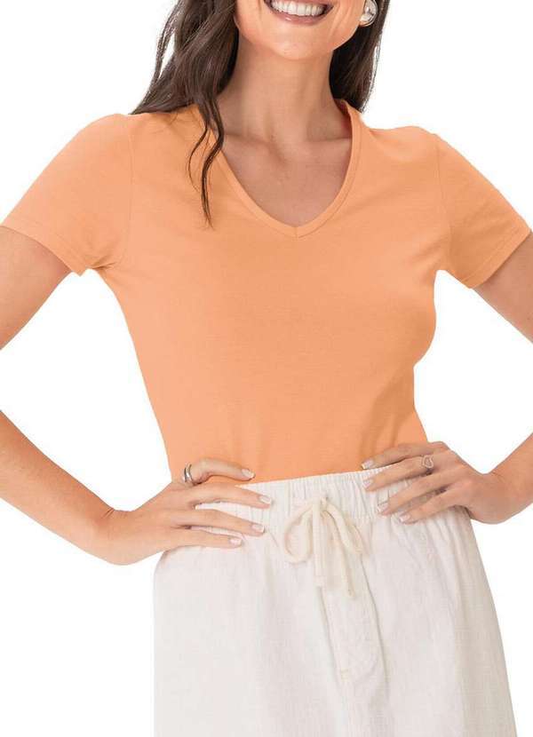 Características: Camiseta Básica Feminina Confeccionada em cotton light Modelagem tradicional acompanha as linhas do corpo com muito conforto Gola em "V" e mangas curtas Ideal para o dia a dia Atende tamanho Plus Size Composição: Cor 50000 Mescla: 85% Algodão, 11% Poliéster e 04% Elastano Demais Cores: 95% Algodão e 05% Elastano