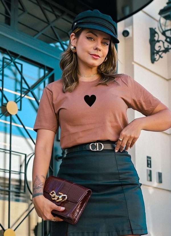 Cianitas - Camiseta Feminina Marrom Claro Coração - Marrom