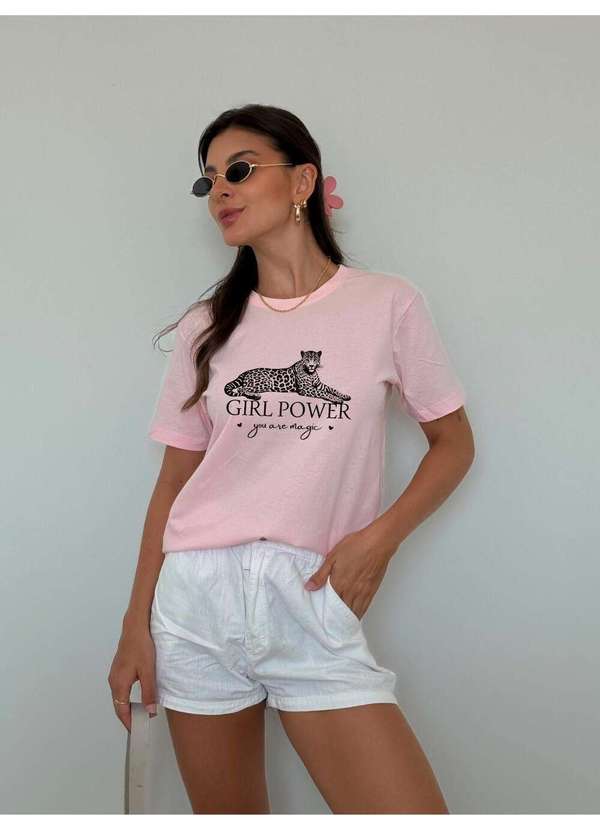 Cianitas - Camiseta Feminina Rosa Bebê Onça Girl Power - Rosa