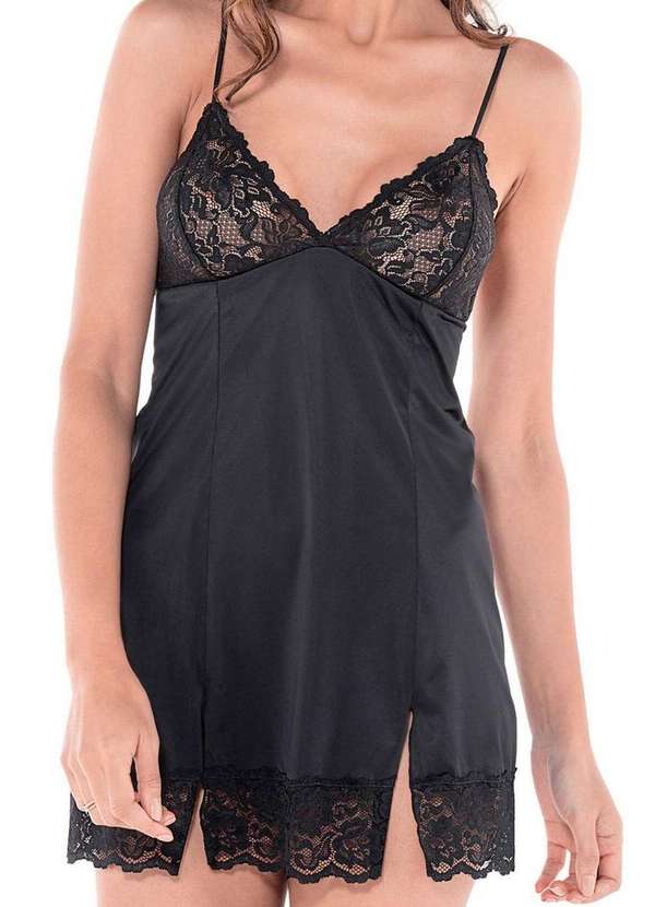 Características: Camisola feminina curta Taças em renda com leve transparência Confeccionada em jersey microfibra Com leve transparência Detalhe de fendas frontais e renda na barra Alças fixas ajustáveis Atende tamanho plus size Composição: Corpo: 100%Poliamida Renda: 85% Poliamida,15% Elastano