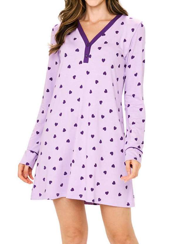 Características: Camisola Feminina Curta Manga longa e decote em V Confeccionada em viscolycra confort Tecido que proporciona toque macio e ótimo caimento Toda em uma linda estampa de coração roxo em fundo lilás Ela possui abertura funcional de 2 botões, charme e conforto na mesma peça Composição: 96% Viscose e 4% Elastano