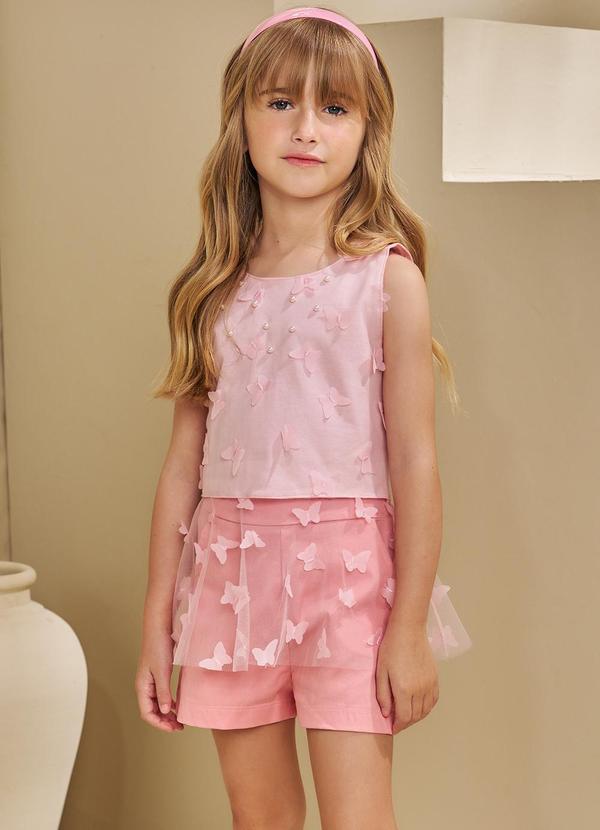 Pokótinha - Conjunto Bata Peplum Tule 3d e Shorts Sarja Rosa