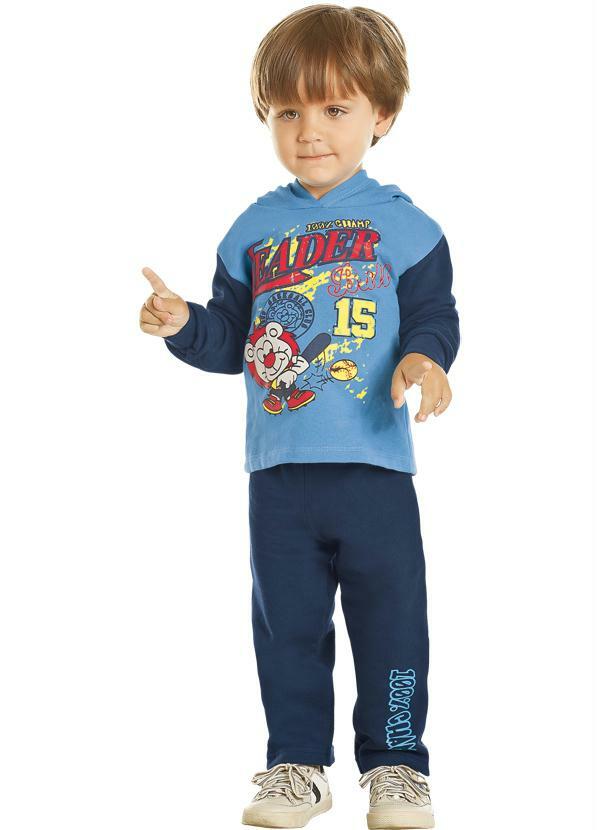 Conjunto bebê, desenvolvido em moletom peluciado. Blusa com estampa frontal e capuz. Cor: Marinho com azul. Tamanhos: 1/2/3.