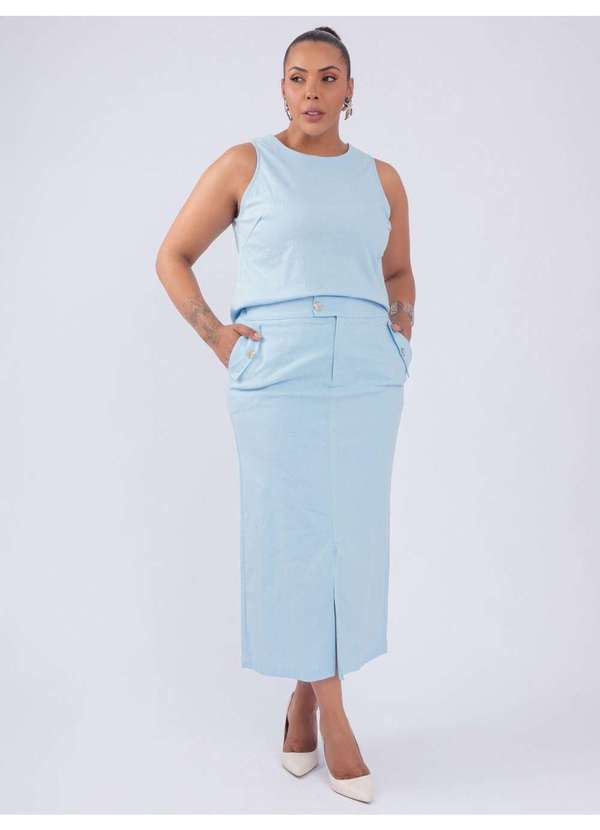 Conjunto camisa e saia, camisa com botão na nuca e manga regata, saia com bolso flap com botão, fenda comprida e forro. Confeccionado em algodão e elastano, forro confeccionado em poliéster e elástano. Guia de Medidas Blusa: 44 ¿ Busto 102cm | Cintura 110cm | Comprimento 55cm 46 ¿ Busto 106cm | Cintura 112cm | Comprimento 56cm 48 ¿ Busto 108cm | Cintura 114cm | Comprimento 57cm Guia de Medidas Saia: 44 ¿ Cintura 82cm | Quadril 108cm | Comprimento 90cm 46 ¿ Cintura 86cm | Quadril 114cm | Comprimento 91cm 48 ¿ Cintura 90cm | Quadril 120cm | Comprimento 92cm Composição: 95% Algodão 5% Elastáno 97% Poliéster 3% Elástano
